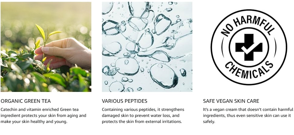 - Power of Green Tea – Catechin and vitamin enriched Green tea ingredient protects your dry skin from aging and helps out emit residue to make your skin healthy and young. (organic green tea in Jeju Island.)