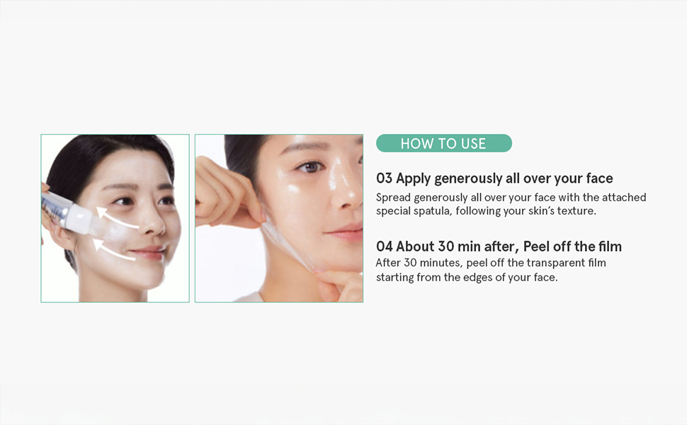 • HOW TO USE: Cleanse your face thoroughly before use. Apply an even layer of the product using the built-in spatula. Allow it to set for thirty minutes. Once completely dry, gently peel it off to reveal a revitalized complexion. Please note that this is NOT A WASH-OFF mask. For optimal results, enjoy this ritual into your daily skincare routine for a radiant & rejuvenated skin.