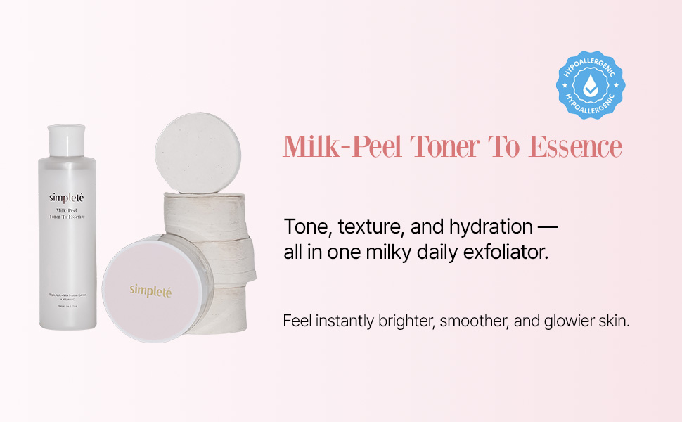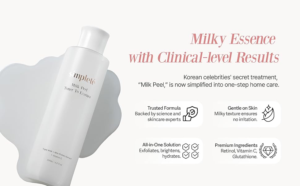- [PRO-GRADE MILK PEEL AT HOME] Simpleté’s Milk Peel Toner to Essence bringt die Kraft professioneller Milchpeeling-Behandlungen in Ihren Alltag – liefert sichtbare Ergebnisse mit Glashaut in nur 10 Sekunden zu 1/250 der Kosten. Diese Doppelfunktions-Formel peelt mit 10 % Triple AHA, glättet unebene Textur, entfernt stumpfe Ablagerungen und spendet tief Feuchtigkeit für einen frischen, strahlenden Glanz – ohne Irritationen oder Trockenheit.