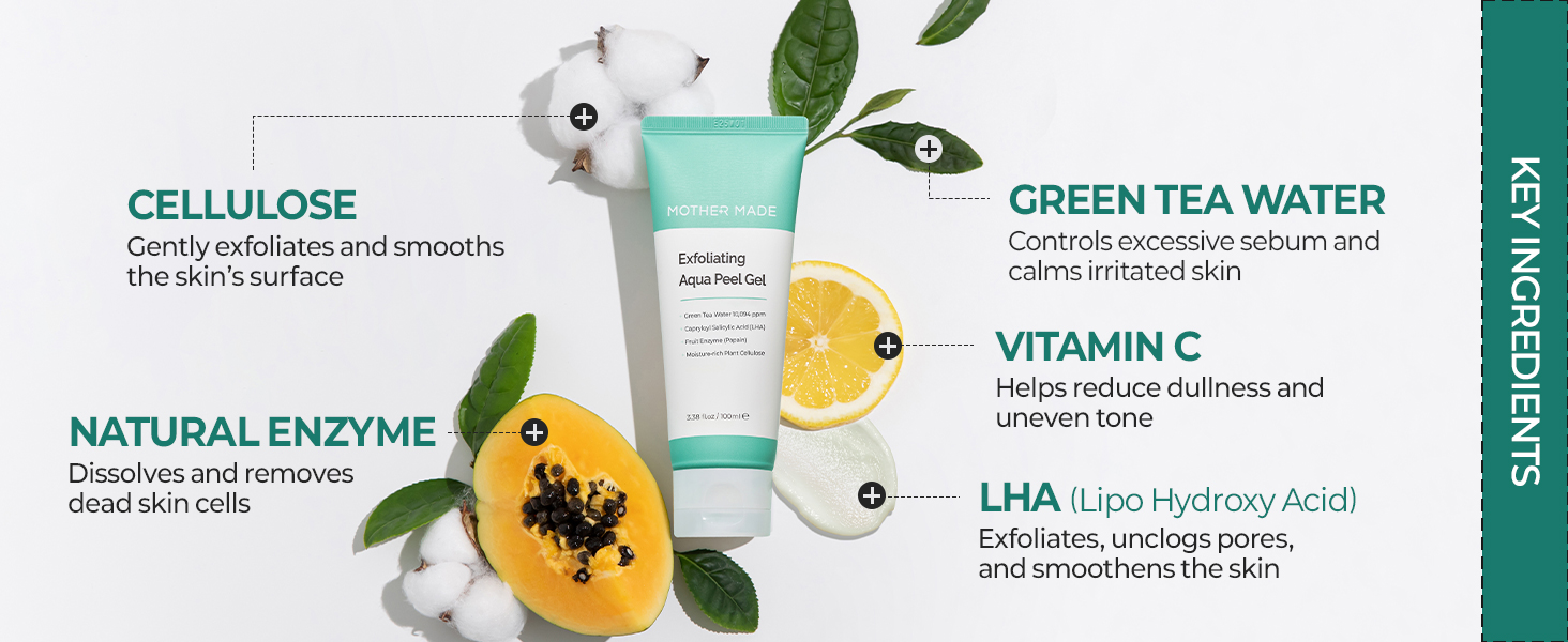 Super Gentle Exfoliation To Skin: Unlike harsh microdermabrasion scrubs or strong chemical acid peels that dissolve proteins, MOTHER MADE Exfoliating Aqua Peel Gel is formulated with moisture-rich cellulose fiber that softly balls up with grime only, without strong chemicals or stress to skin