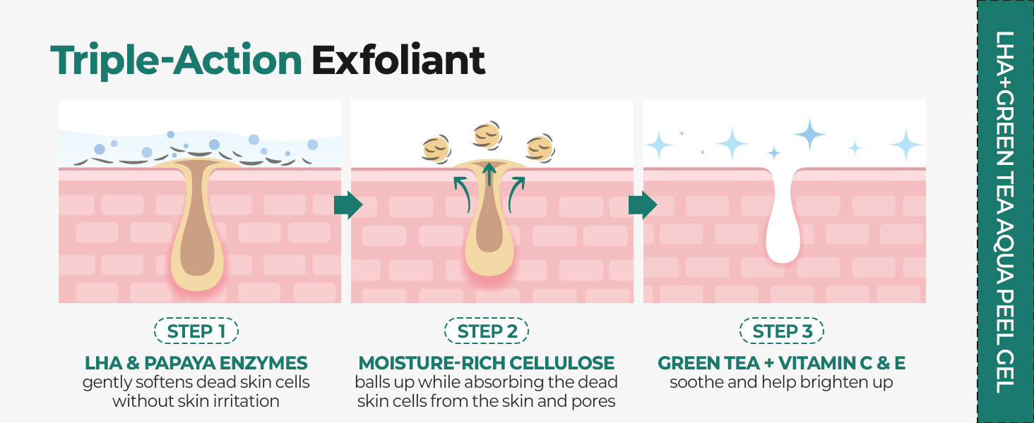 Hydrating & Soothing: Infused with natural skin conditioners such as Green tea, Vitamin E, Hyaluronic Acid, and Baobab Seed Extract, this vegan face peeling gel works without stripping the skin of essential moisture and leaves it supple even after peeling!